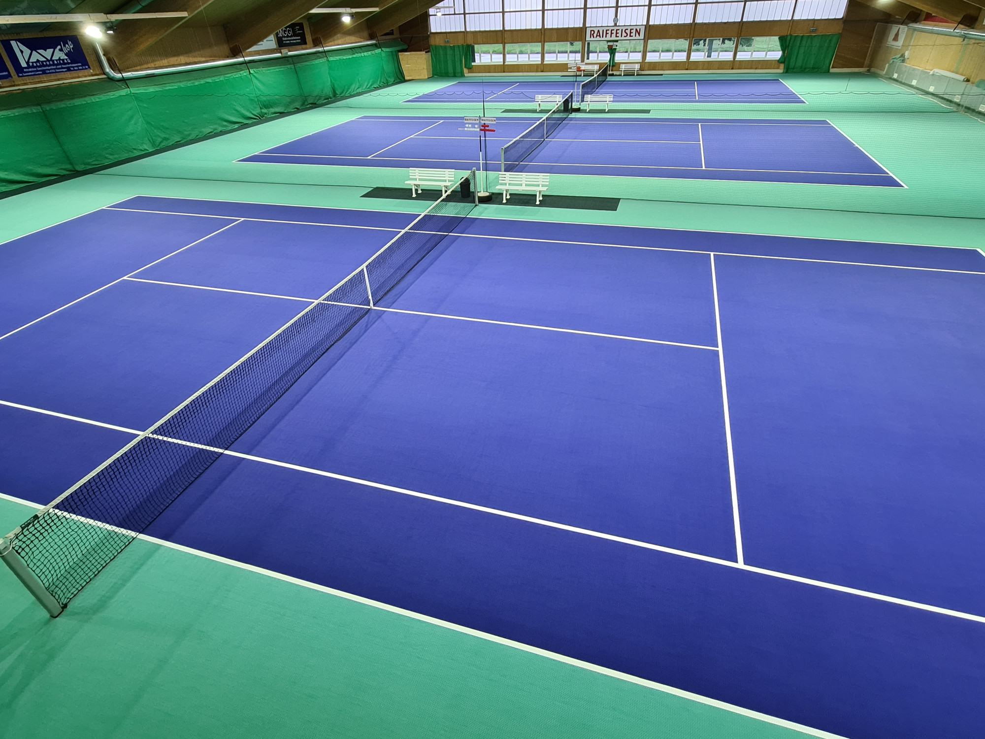 Der französische Vorläufer des heutigen Spiels, Jeu de Paume (Spiel mit der Handinnenfläche) wurde in Klosterhöfen, später in Ballspielhäusern auf einem rechteckigen Feld gespielt. Die Spieler machten ihre Angabe, indem sie den Ball über das Netz gegen eine Wand schlugen, welche entlang des Feldes verlief. Die Zuschauer saßen an der Wand gegenüber. Linien teilten das Feld in vier fünfzehn Zoll (knapp vierzig Zentimeter) breite, parallel verlaufende Streifen zu beiden Netzseiten.